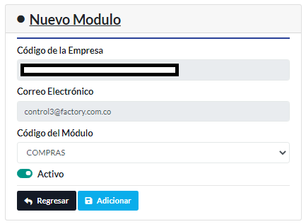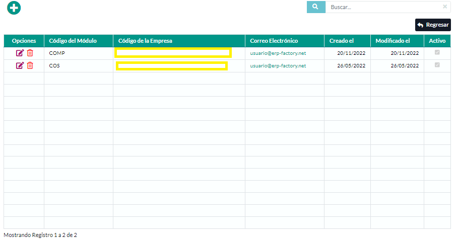 Esta opción permite la gestión de correos (crear, editar, visualizar y eliminar correos) y asignación de módulos licenciados a las empresas.