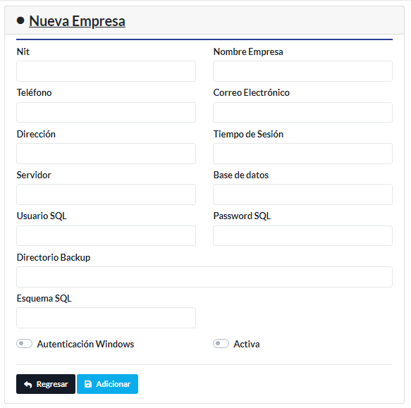Si selecciona este botón, el sistema le permite crear empresas. El sistema le presentará el siguiente formulario: