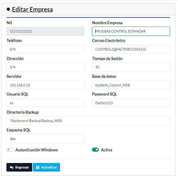 14.Activa: Active el botón si requiere que la empresa se encuentre activa.
