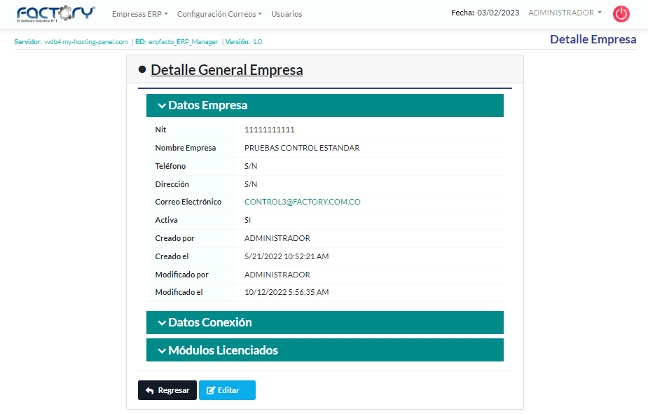 Esta opción permite la gestión de empresas (crear, editar, visualizar y eliminar empresas, además; licenciar, quitar licencias, crear y restaurar backups).