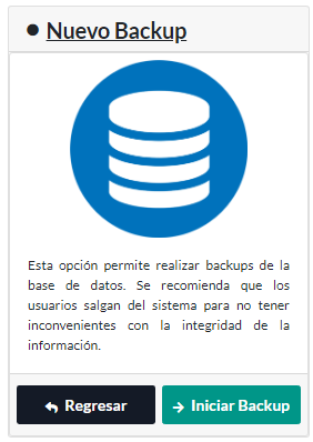 Permite realizar la copia de la información de la empresa. El sistema le presentará la siguiente pantalla donde se debe seleccionar el botón Iniciar Backup para comenzar con el proceso: